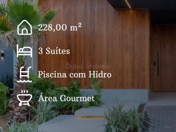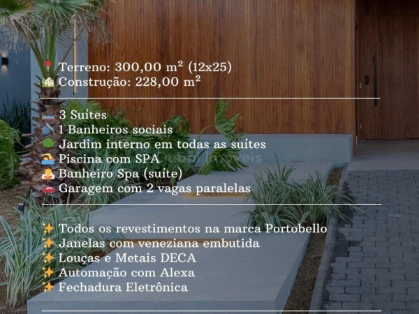 - Terreno: 300,00 m² (12x25)<br><br>- Construção: 228,00 m²<br><br>- 03 Suítes - 01 Suíte master & Spa + 02 Suítes<br><br>- 01 Banheiro social<br><br>- Jardim interno em todas as suítes<br><br>- Piscina com SPA<br><br>- Churrasqueira Gourmet<br><br>- Garagem com 2 vagas paralelas<br><br>- Todos os revestimentos na marca Portobello<br><br>- Janelas com veneziana embutida<br><br>- Louças e Metais DECA <br><br>- Automação com Alexa<br><br>- Fechadura Eletrônica<br><br>- Valor R$1.850.000,00<br><br><br>Com espaços setorizados esta casa tem como um dos principais atributos sua funcionalidade. As Suítes isoladas na área privativa da casa, deixam a integração dos espaços sociais tomarem conta e criarem um ambiente fluido e aconchegante para as ocasiões do dia-a-dia.<br>Área de lazer exuberante<br>Além dos espaços rotineiros, encontramos uma bela área gourmet, separada da cozinha e ao mesmo tempo apoiada por ela. Uma piscina ao fundo deixa o ambiente mais agradável e interessante. 1897
