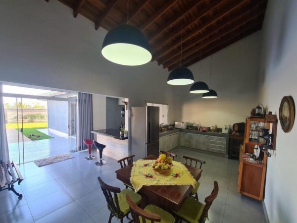 área de serviço. Piso porcelanato inclusive na varanda e no entorno da casa e dá piscina, ar condicionado na suíte e em um dos quartos. Pé direito alto, ótimo acabamento. Quintal amplo e gramado, Churrasqueira e forno próximo a piscina.