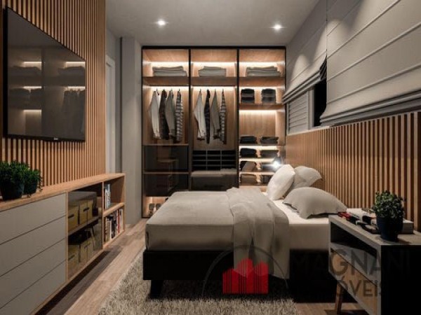 Suíte com guarda-roupa planejado, cabeceira e criado mudo.