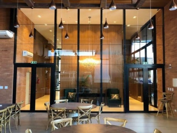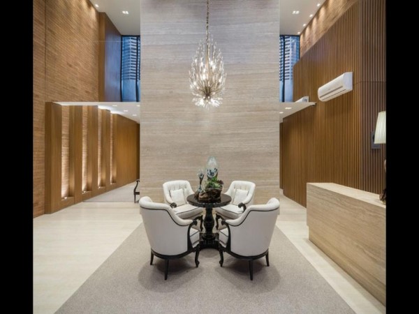 Fachada externa espelhada, hall de entrada todo decorado e mobiliado.