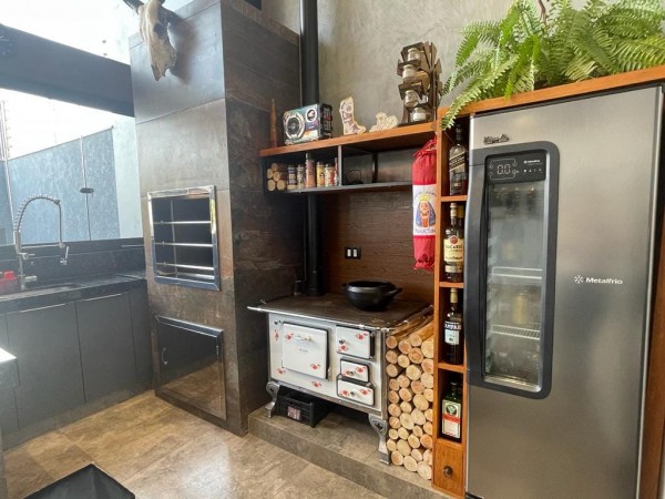 Churrasqueira, bancada, fogão a lenha.