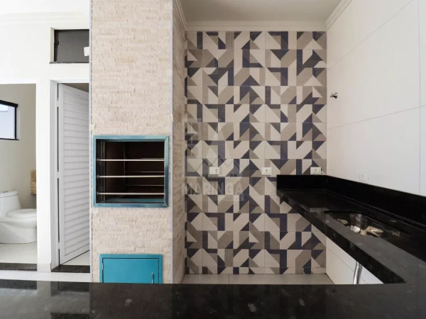 Área Gourmet: - Bancada em granito - Pia com cuba em inox - Churrasqueira em porcelanato estilo pedra, com acabamento em inox - Pendentes