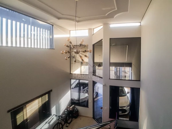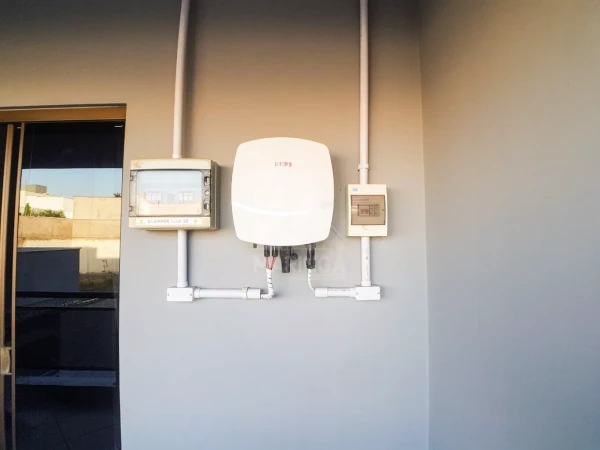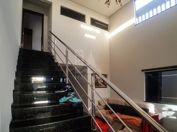 Detalhes: - Pisos em cerâmica no primeiro pavimento, e laminado na suíte - Acabamento em granito nas portas e janelas - Escada em granito - Corrimão em inox - Guarda corpo da sacada em alumínio e vidro - Janelas em vidro temperado - Iluminação em LED - Lustre na sala - Molduras em gesso, e rebaixamento em gesso na sala com sancas - Cerca elétrica Big Haste já com alarme e sensores na casa - Cerca de arame farpado Ouriço - Portão eletrônico basculante - Portão social - Interfone - Gás encanado - Placas de energia solar
