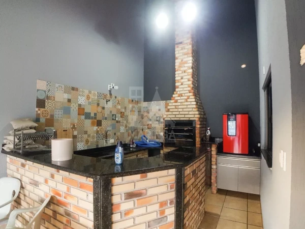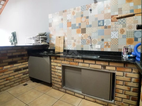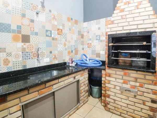 Área Gourmet: - Bancadas em granito com detalhes em tijolinho - Churrasqueira com acabamento em granito - Armários - Pia com cuba em inox - Cooktop
