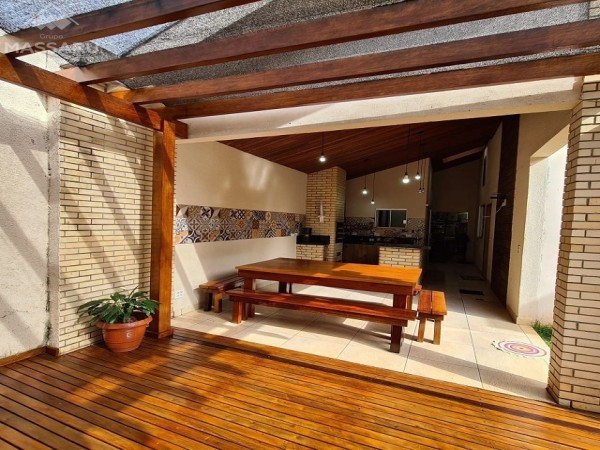 Espaço gourmet com churrasqueira, deck em madeira com pergolado e banheiro.