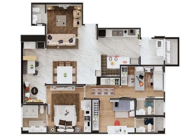 São 121m², sendo 3 Suítes, Sala integrada com Sacada Goumet, medidores individuais de água, energia e gás. Piso laminado nos quartos. Acesso social com Biometria.