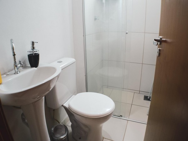 Banheiro com box em vidro blindex.